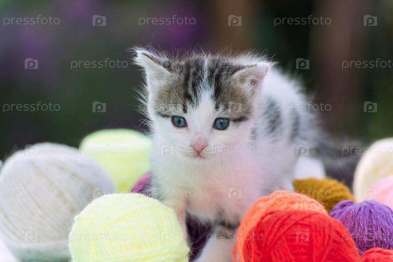 Белый котенок в клубках