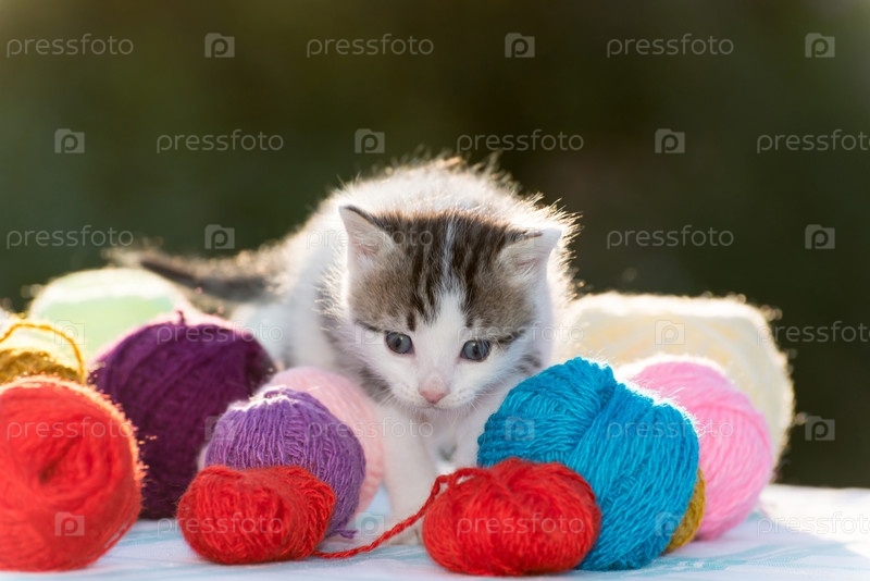 Белый котенок в клубках