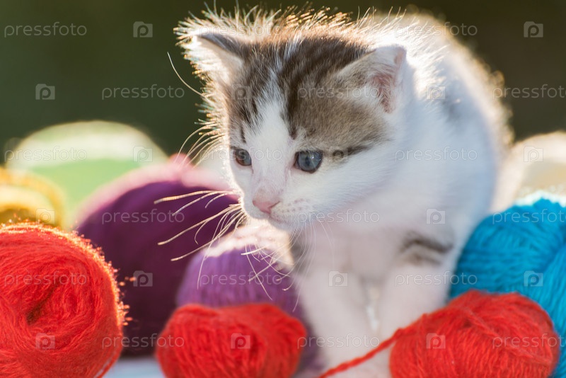 Белый котенок в клубках