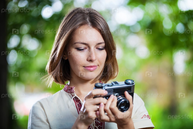 Молодая женщина со старым фотоаппаратом