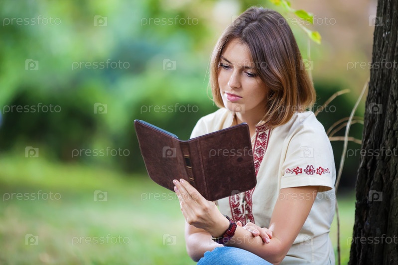 Молодая привлекательная женщина с книгой в парке