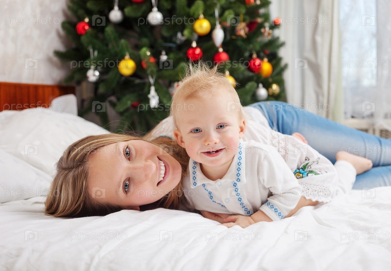 Счастливая мать с сыном на кровати