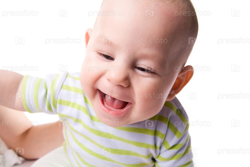 Фото счастливого ребенка, смеющегося над белым фоном