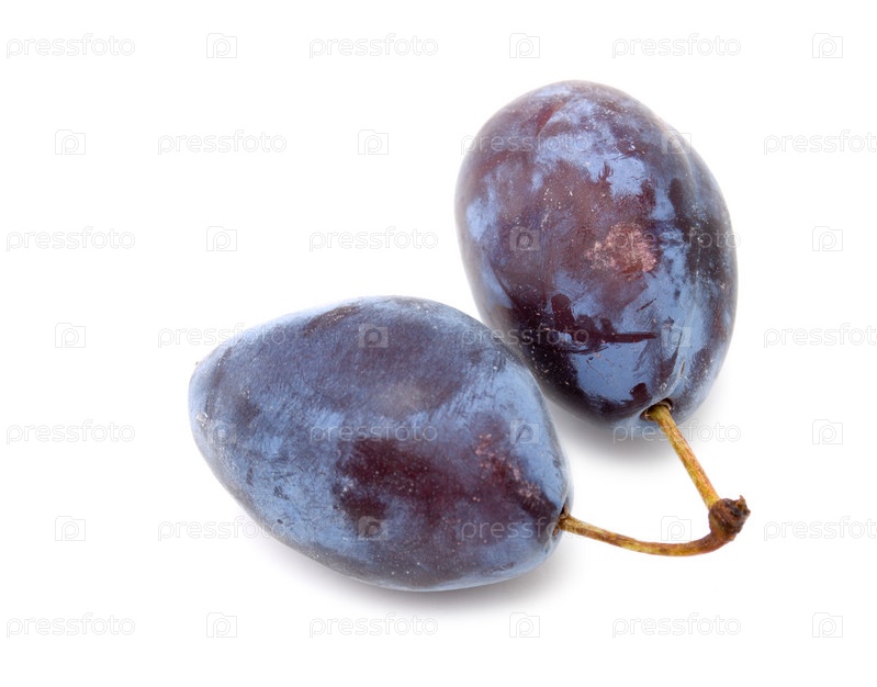 Две спелые сливы на белом фоне