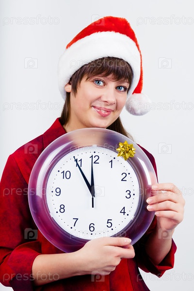 Голубоглазая женщина в новогодней шапке с часами