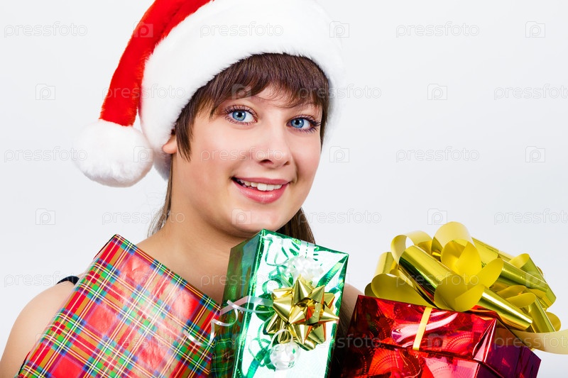 Голубоглазая женщина в новогодней шапке с подарками