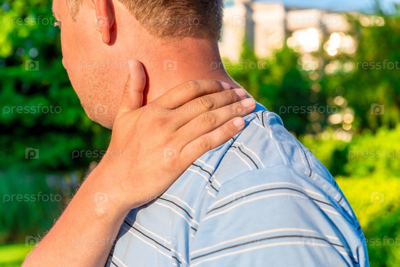 Мужчина массирует больное плечо на открытом воздухе