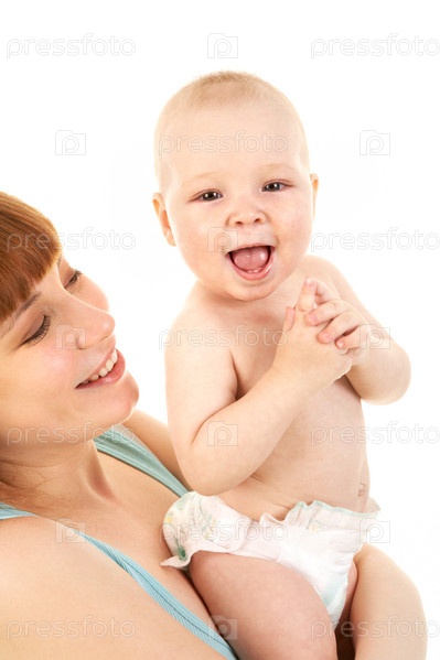 Счастливые мама с малышом на белом фоне