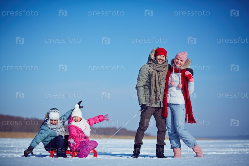 Семья катается на санках