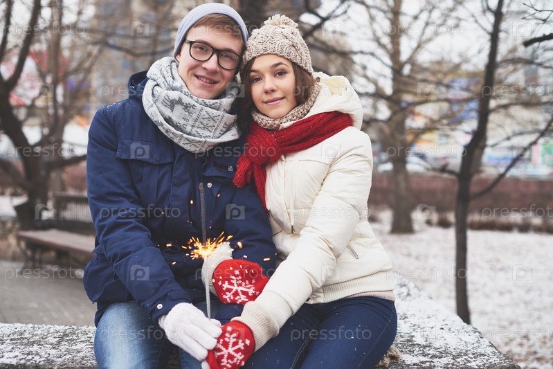 Влюбленная молодая пара с бенгальским огнем