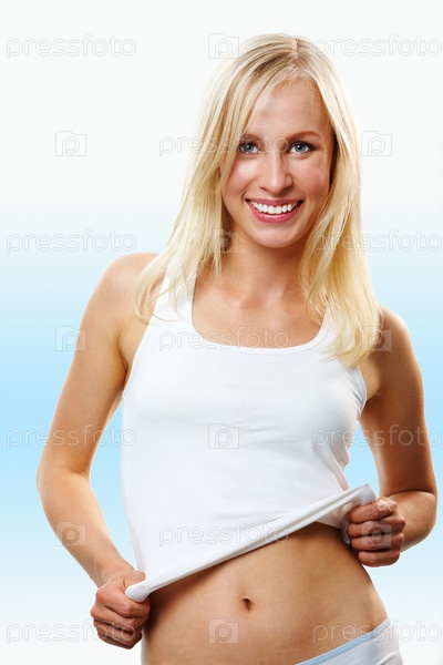 Молодая красивая девушка приподняла майку