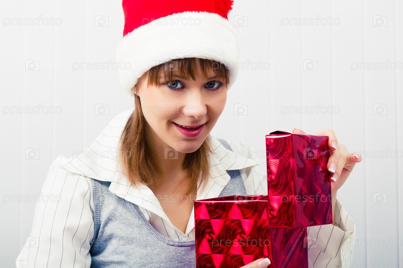 Девушка в колпаке Санты с подарком