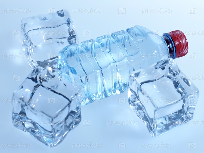 Источниковая вода в бутылке с кубиками льда с каплями воды