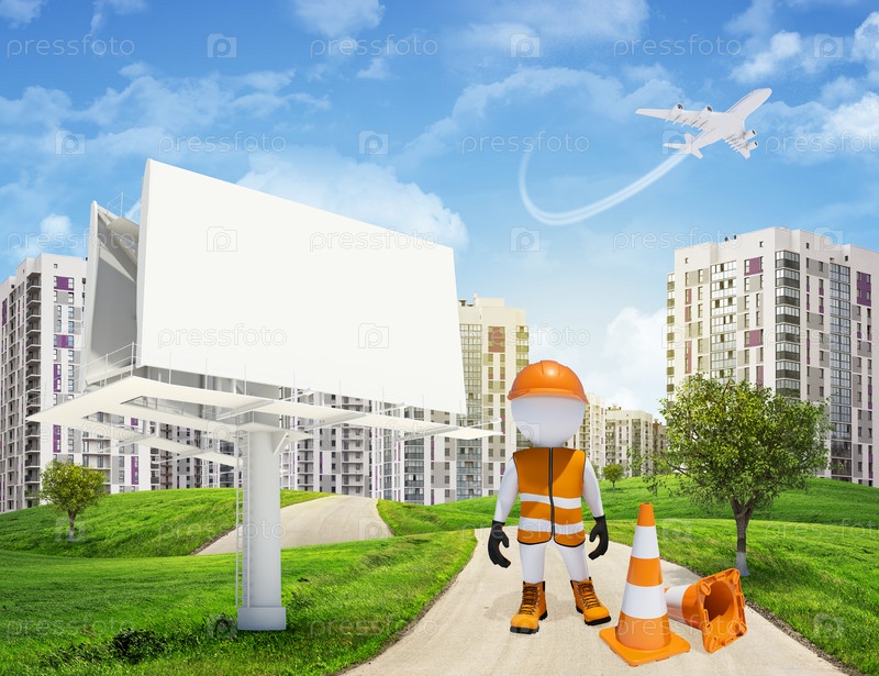 Трехмерный рабочий на дороге, идущей через зеленые холмы в направлении города