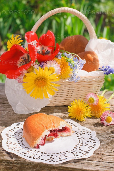 Вишневый пирожок на фоне плетеной корзины с цветами и выпечкой