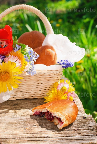 Вишневый пирожок на фоне плетеной корзины с цветами и выпечкой