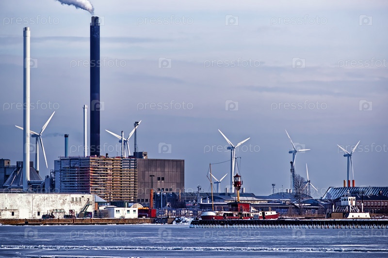 Электростанция и ветровые турбины в морском порту