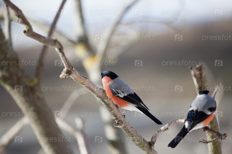 Снегирь сидит на ветке дерева на размытом фоне