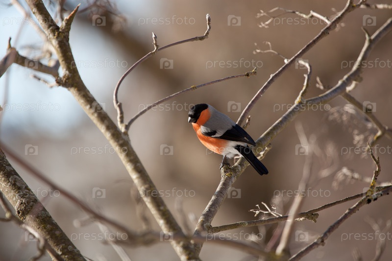 Снегирь сидит на ветке дерева на размытом фоне