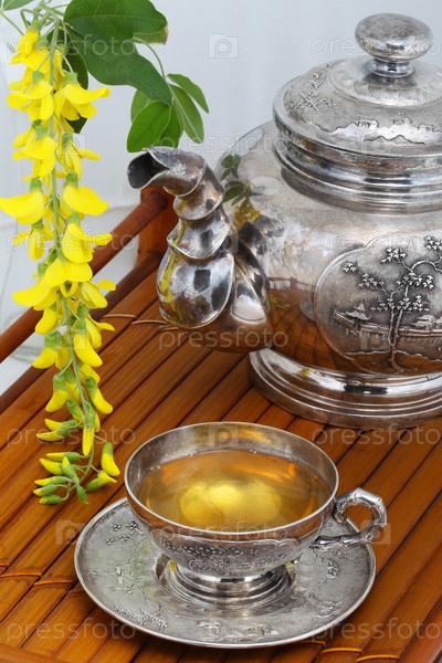 Чайный сервиз на бамбуковом подносе и ветка желтой акации
