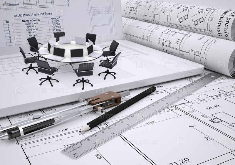 Строительные чертежи и инструменты на столе