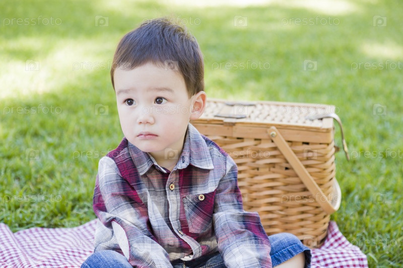 Мальчик сидит в парке возле корзины для пикника