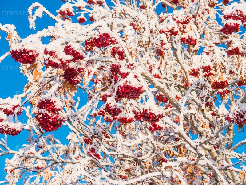 Красные ягоды рябины, покрытые снегом, висят на дереве