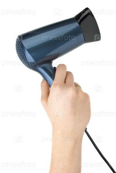 Компактный синий фен в руке. Белый фон