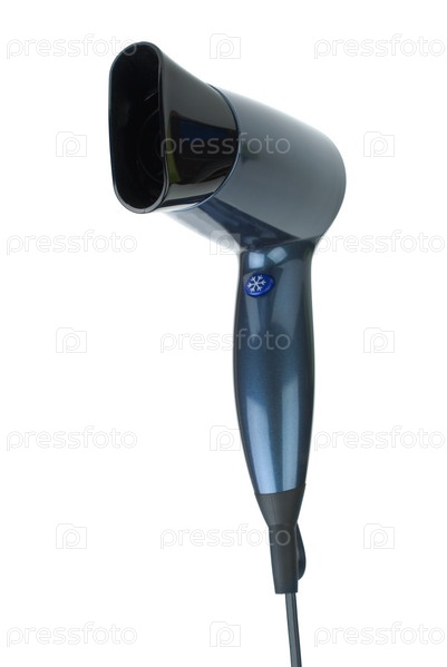 Компактный фен изолирован на белом фоне. Малая глубина резкости. Точка фокуса - насадка-рассеиватель