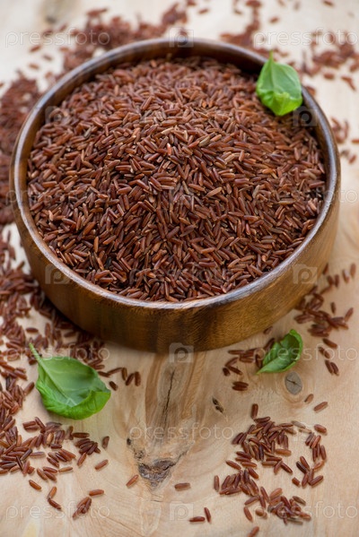 Красный рис в деревянной миске крупным планом