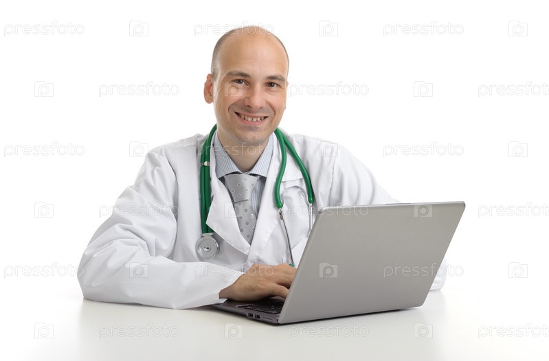 Доктор сидит за столом с ноутбуком