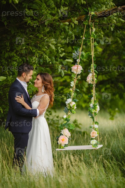 Невеста и жених на качелях в парке