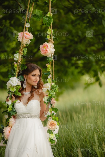Красивая невеста на качелях в парке