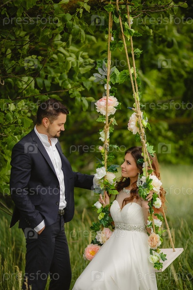 Невеста и жених на качелях в парке