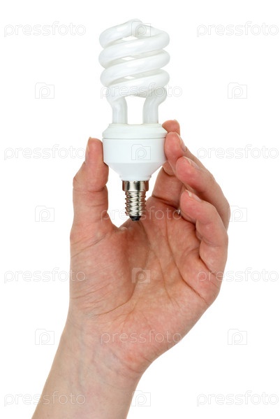 Рука держит за цоколь компактную спиральную энергосберегающую лампочку. Белый фон