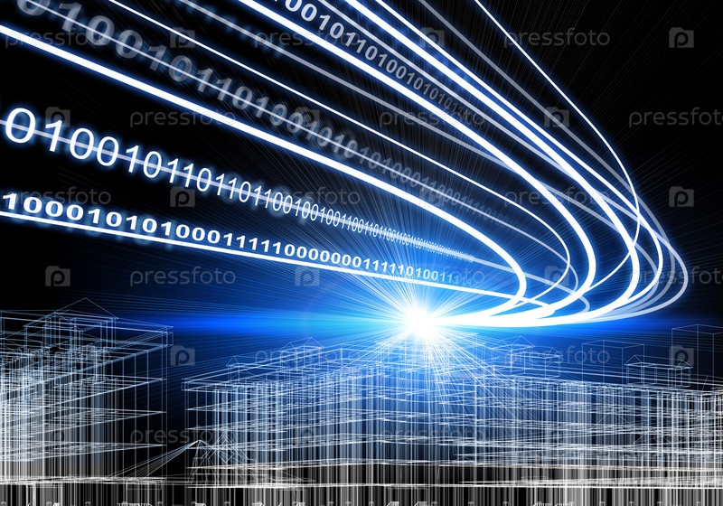 Каркасные здания, лучи света и цифры на темном фоне