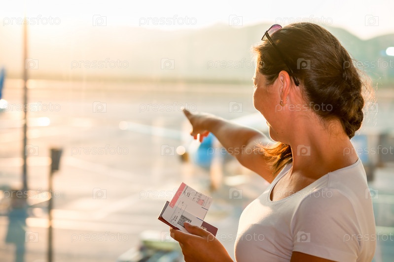 Девушка показывает на самолет