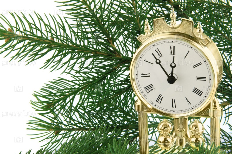 Еловые ветви и часы на белом фоне