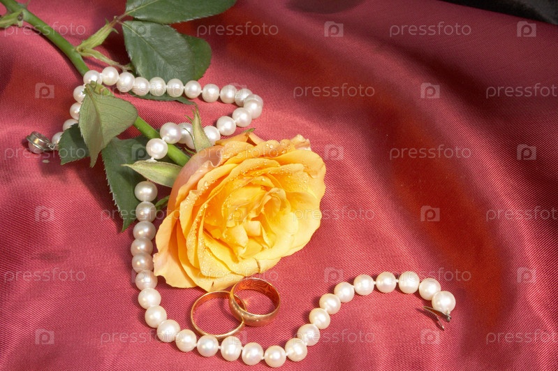 Желтая роза, обручальные кольца и нить жемчуга на красной ткани
