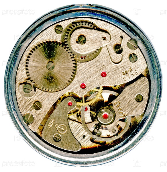Часовой механизм, крупный план на белом фоне