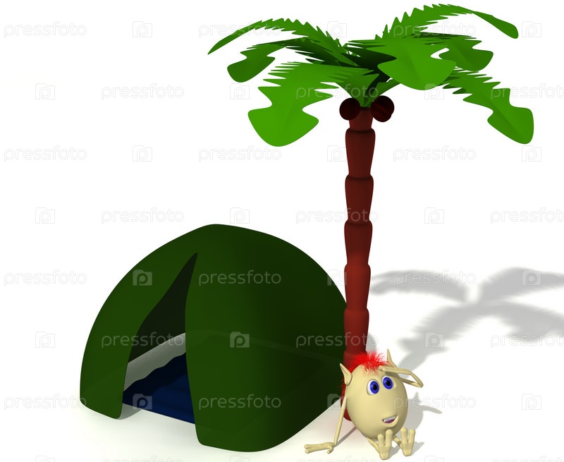 Забавный человечек закрывает глаза от солнца, сидя под пальмой