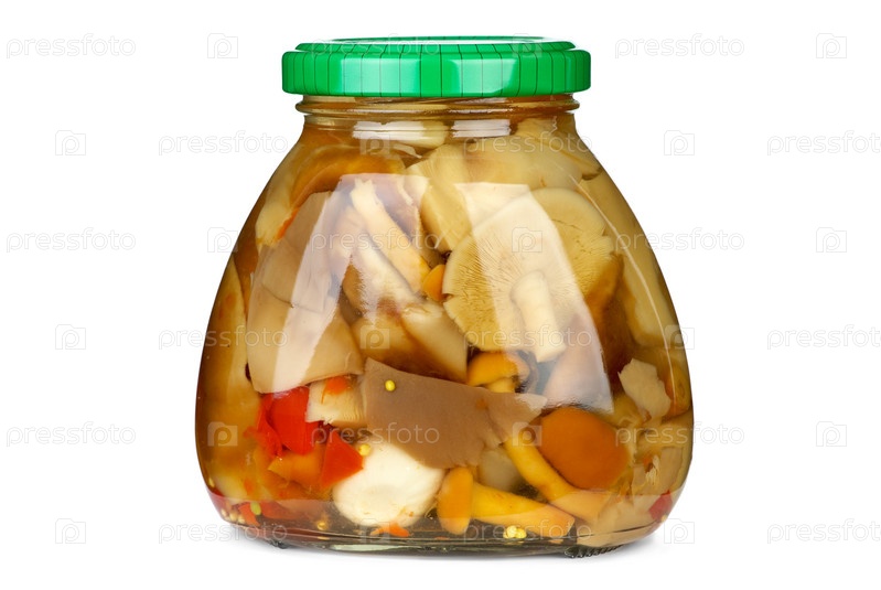 Грибное ассорти в стеклянной банке на белом фоне