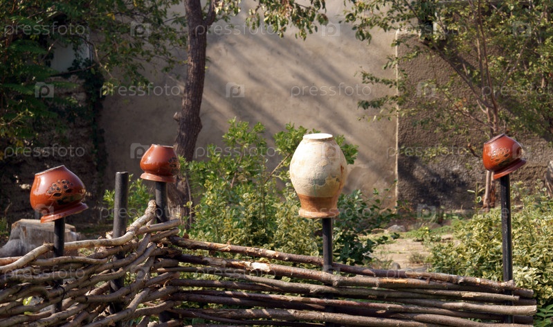 Глинистые горшки на палисаде в деревенском доме