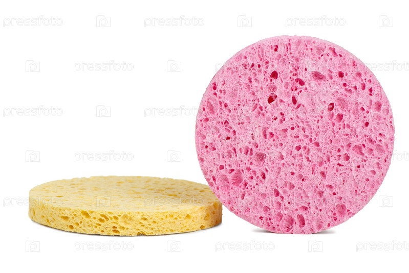 Розовая и желтая косметические губки на белом фоне