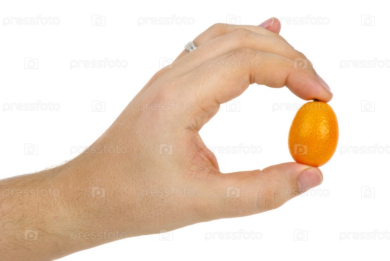 Плод кумквата в руке. Белый фон