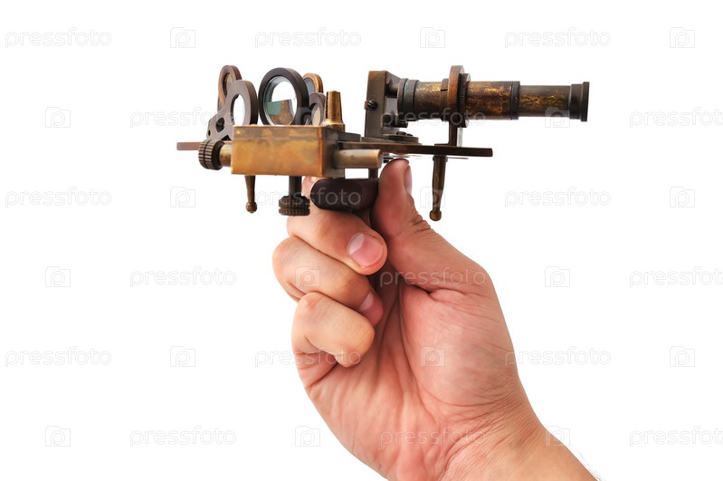 Старый секстант в руке на белом фоне