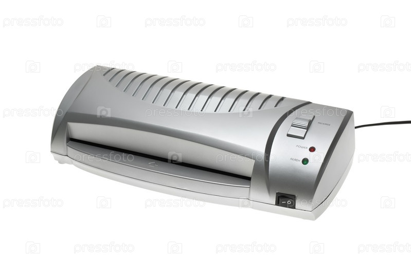 Небольшой серебристый ламинатор на белом фоне