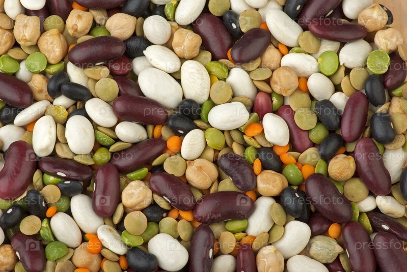 Продуктовый фон: смесь из разных бобовых (зеленая и красная чечевица "футбол", черная, коричневая и белая фасоль, лущенный зеленый горошек и горох нут)
