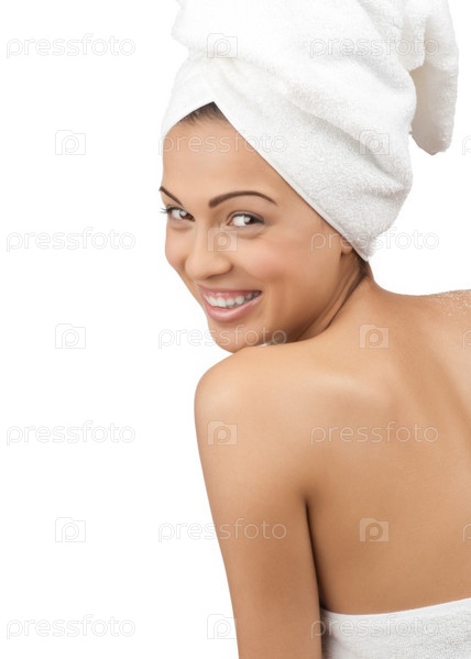 Портрет молодой красивой женщины в белом полотенце. Изолировано на белом фоне