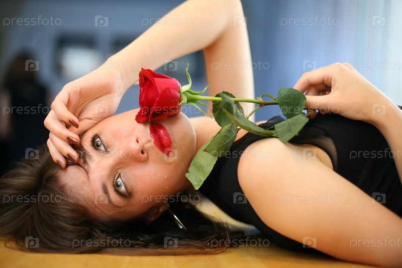 Портрет молодой грустной девушки с красной розой